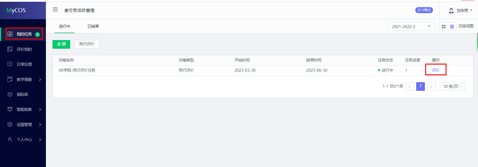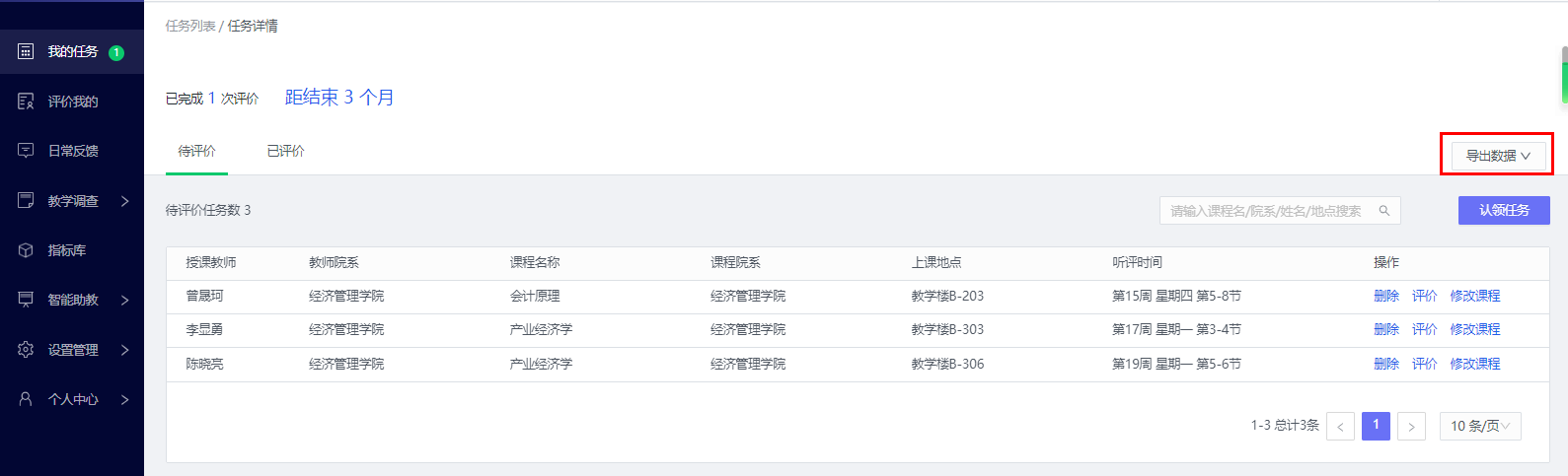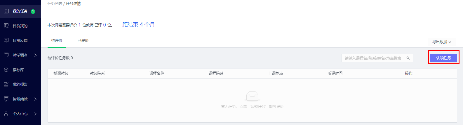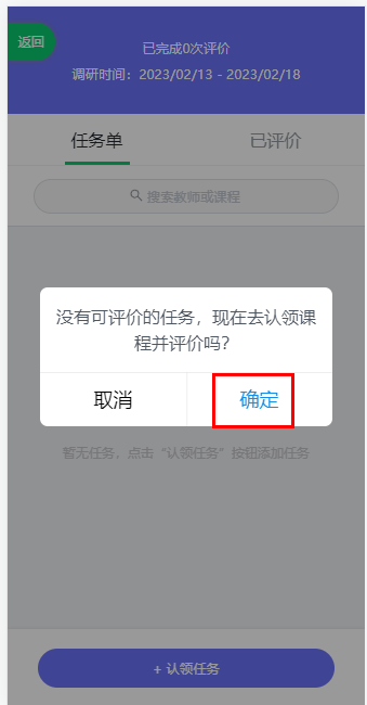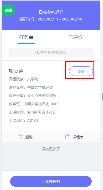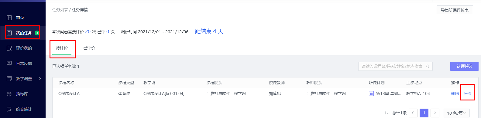 认领成功后,在待评价中可看到已认领的课程,点击【评价】即可进行课程评价