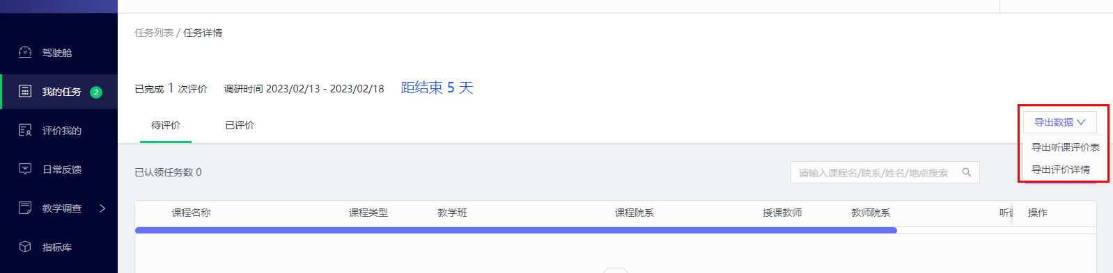 在【我的任务】中选择需要导出的任务,点击【评价】,然后选择【导出数据】,由教师自行决定导出评价表,还是数据表。(两种形式截图展示)