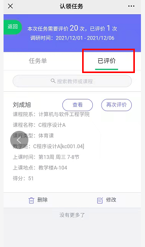 已评价的课程可以在【已评价】中进行查看、修改,或再次评价