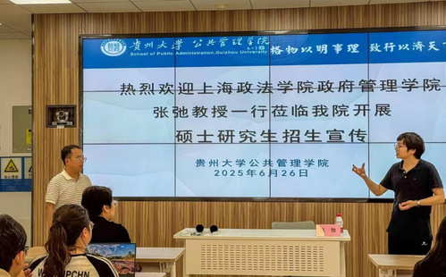 为进一步扩大学校优质生源渠道,加强校际学术交流与人才培养合作,6月26日,政府管理学院国际政治教研室主任张弛教授一行赴贵州大学开展 2025 年硕士研究生招生宣讲活动,贵州大学公共管理学院副院长、东盟研究院院长杨达教授以及贵州大学东盟研究院的部分师生参与了本次宣讲。