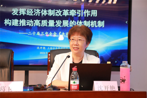 沈开艳围绕国有经济与民营经济发展、新质生产力与实体经济高质量发展,结合宏观治理体系和城乡融合发展、高水平对外开放等,详细解读了党的二十届三中全会提出的市场经济体制改革的核心内容。整场报告高屋建瓴、深入浅出,对学校广大干部深入学习领会党的二十届三中全会精神具有重要的指导和启发意义。
