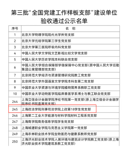 近日,教育部公示第三批新时代高校党建示范创建和质量创优工作及第二批高校“双带头人”教师党支部书记工作室建设单位验收结果,共有10个高校党委、99个院系党组织、995个党支部、100个“双带头人”教师党支部书记工作室通过验收。上政第18学生党支部成功通过第三批“全国样板党支部”验收。